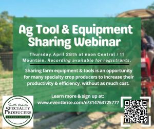 S.D. Specialty Producers Association (SDSPA) is hosting a webinar on April 28, 2022 at 12 PM Central/11 AM Mountain featuring a panel of tool sharing organizers who will discuss their setup, advantages of tool sharing, considerations, and more, while also being available for questions.