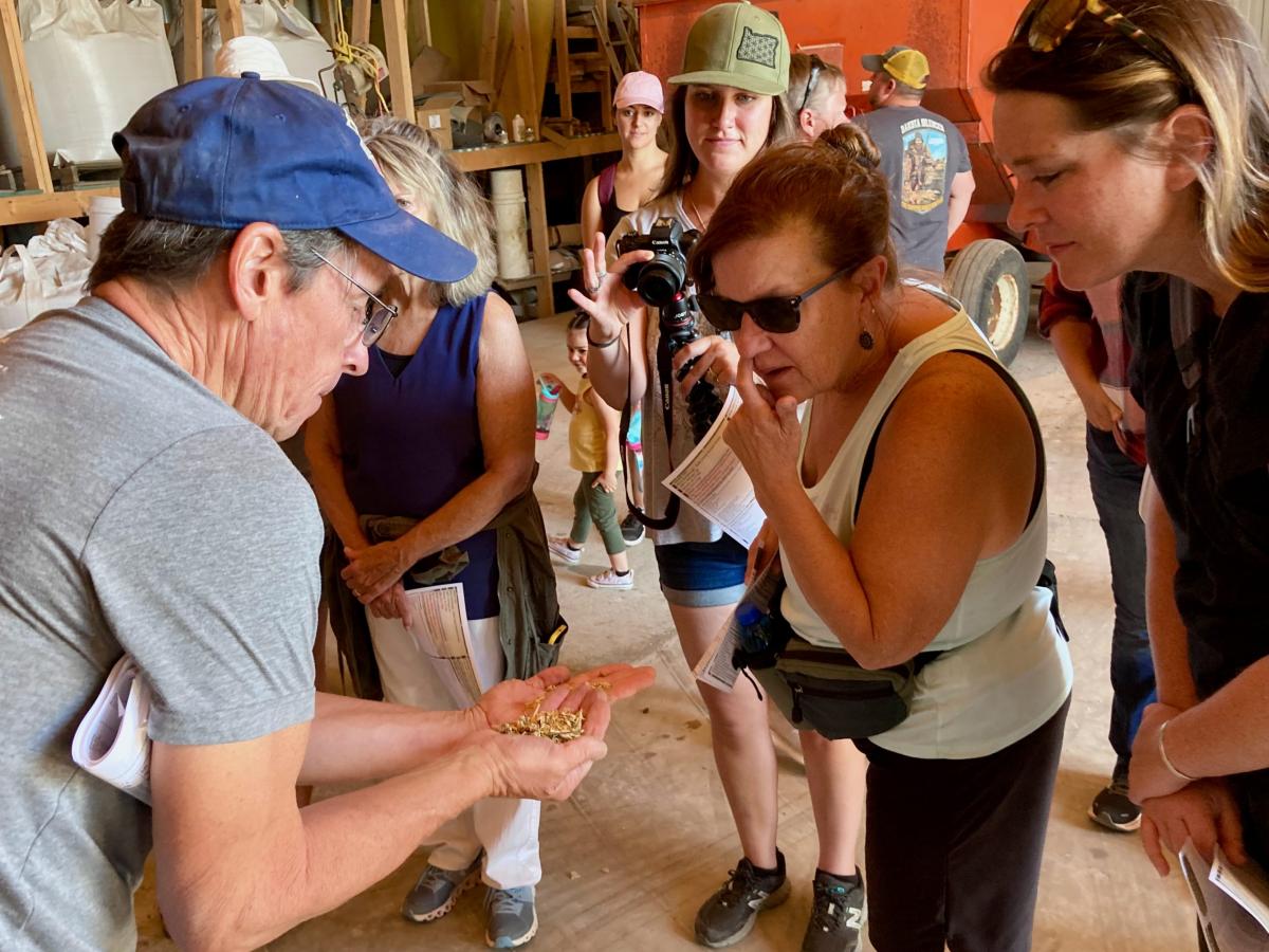 At Belle Valley Ancient Grains, the attendees first visited the big shop where owner, Brian Stambaugh, presented information about their farm history, farm products, ancient grains (e.g. definition, characteristics, etc.), the grain farming process, the Belle Fourche Water Irrigation system, field equipment, weed and pest controls, and a bit on grain cleaning equipment.