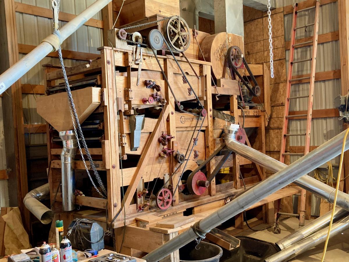 The group then moved to the small shop where freshly baked bread and pancakes were served. Stambaugh presented additional information about grain cleaning, packaging, and milling. Stambaugh had several displays of grain cleaning and packaging equipment and briefly demonstrated a couple pieces of the grain cleaning equipment. Participants had an opportunity to purchase milled grain products.