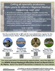 If you are interested in gathering with other producers and local food supporters in your region of the state, be sure to register for the regional meetups that SDSPA will be hosting in Jan & Feb 2023.