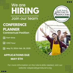 The South Dakota Specialty Producers Association (SDSPA) is seeking a highly organized and detail-oriented Event Planner to manage all aspects of a two-day conference focused on specialty producers, Urban Ag and small production operations. The remote contractual position provides 264 hours from May 15, 2024-Feb. 28, 2025 at a rate of $30 per hour.