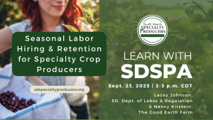S.D. Specialty Producers Association (SDSPA) is offering two webinars in September focused on business development. Join us on Tues., Sept. 23, 2025 at 2 p.m. Central for a discussion on ‘Seasonal Labor Hiring and Retention’ for specialty crop producers.