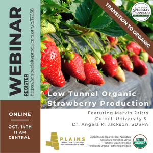 Join the S.D. Specialty Producers Association for an informative webinar on Low Tunnel Organic Strawberry Production in the Plains States with Marvin Pritts, professor at Cornell University. We will explore practical techniques for extending the growing season, improving berry quality, and protecting plants from unpredictable weather.