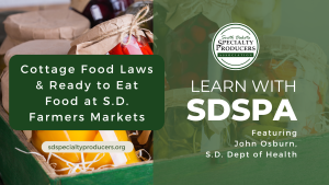 Description: This video is a recording from the SD Farmers Market Coalition’s meeting on Sept. 17, 2025. John Osburn with the South Dakota Department of Health shared about cottage food laws including what is covered, applicable sales, more about the required online training, temporary food vendors, product testing, and more! The resources Osburn mentioned are linked below: