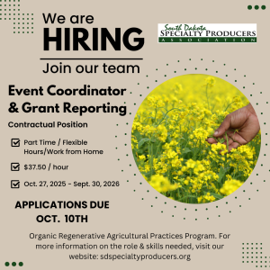 The South Dakota Specialty Producers Association (SDSPA) is seeking a part-time Event Coordinator and Grant Reporting Contractor for their Organic Regenerative Agricultural Practices Program (O-RAPP). This is a remote contractual position with flexible scheduling from approximately Oct. 27, 2025 – Sept. 30, 2026 at a rate of $37.50 per hour.