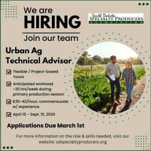 The South Dakota Specialty Producers Association (SDSPA) is seeking an Urban Ag Technical Advisor. This is a remote contractual position with flexible scheduling from approximately April 15 – Sept. 15, 2026. A workload of approximately 30 hours per week during the primary production season is anticipated.
