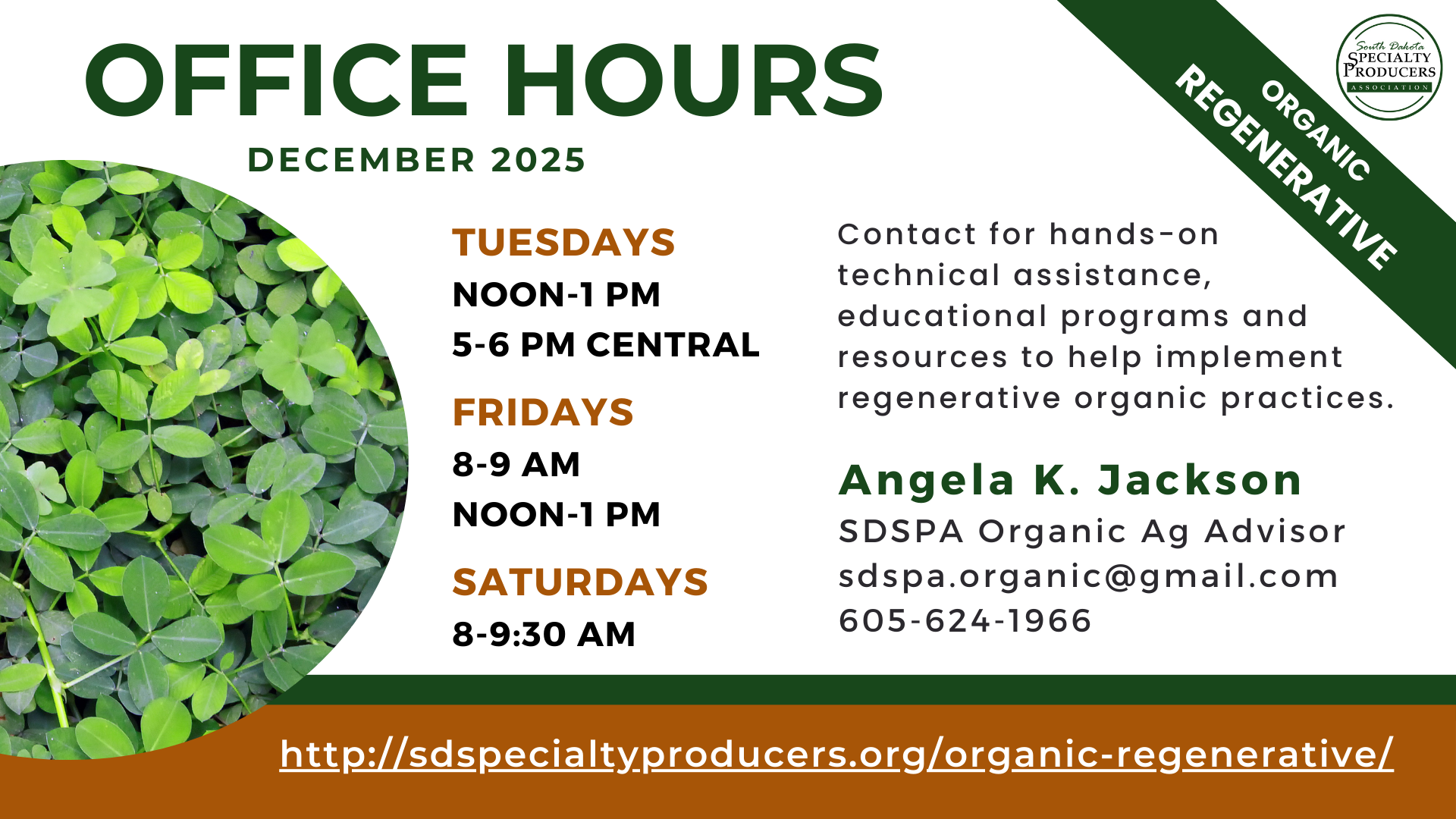 Producers and resources providers needing technical assistance with organic regenerative agriculture production are invited to contact SDSPA. During office hour Dr. Angela K. Jackson, SDSPA’s Organic Ag Advisor, is available via phone at 605-624-1966 or email to assist with your questions.