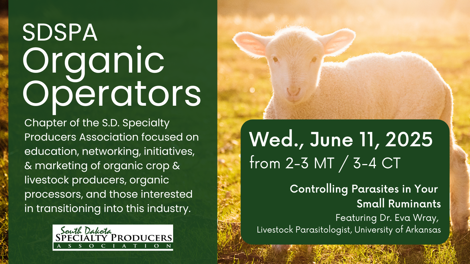 OnlineThe next SDSPA Organic Operators meeting is June 11th at 3 pm CT via Zoom. Dr. Eva Wray will discuss controlling parasites in your small ruminants. Wray has been at the University of Arkansas Parasitology Lab for 15 years and works closely with U of A Cooperative