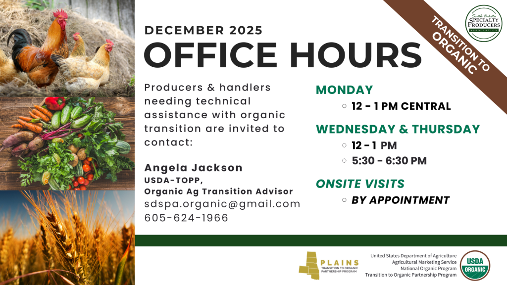 Producers and handlers needing technical assistance with transitioning to organic production are invited to contact SDSPA. During office hour Dr. Angela Jackson, SDSPA’s Organic Ag Transition Advisor, is available via phone at 605-624-1966 or email to assist with your questions. Mondays | 12-1 PM Wednesdays | 12-1